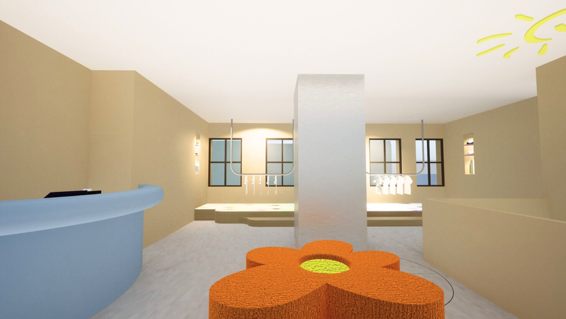 On the retail floor, as you enter from the main door, you'll find a unique arrangement of elements. A light blue semi-circular till, a logo-shaped sofa with a flower design, and a modern chandelier on the ceiling. Walking past these, you'll discover a small elevated stage with different coloured carpets, where the whole collection is showcased. This layout adds style and interest to the shopping experience.